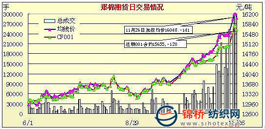 11月26日,鄭棉CF1005合約小幅低開,早盤下探受到多頭買盤推動大幅回升,隨后在平倉盤的壓制下走低盤跌,午后加速下滑后橫向盤整,日線形成陰線,主要合約成交量較前一日下滑,持倉少量增加。CF1001合約日成交5348手,日減倉1116手,終盤持倉量21870手;CF1005合約日成交426800手,日增倉3630手,終盤持倉量206758手?;久媲闆r:國家相關(guān)重要部門在發(fā)改委開會研究確定了棉花進(jìn)口配額將在年底前發(fā)放,并且會根據(jù)市場變化情況,不排除繼續(xù)增加拋儲計劃的可能。并將協(xié)調(diào)解決好新疆棉運(yùn)輸情況。此政策有利于穩(wěn)定當(dāng)前紡企攀高購棉心理,有利于改善后期棉花供應(yīng),給紡織企業(yè)吃了一顆“定心丸”。也從而警示棉花企業(yè)不要過于囤棉賭后市,適價銷售較為穩(wěn)妥。受此消息影響,拋儲競拍企業(yè)積極性有所下降,由之前的爭搶競價轉(zhuǎn)為觀望較多。以此來看,后期競拍價格有望趨穩(wěn)。但當(dāng)前紡織市場生產(chǎn)訂單有所上升,最終棉花價格的走勢與市場需求緊密相聯(lián),如果配額下發(fā)過于滯后,棉花價格仍有繼續(xù)攀高可能。