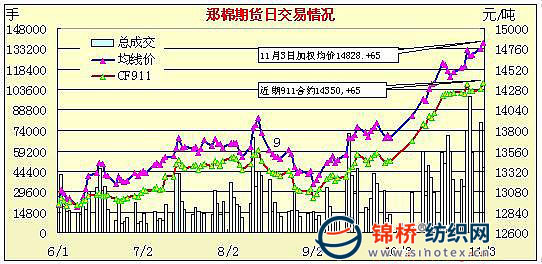 11月3日,鄭棉主要合約CF1001、CF1005合約早盤(pán)窄幅盤(pán)整,午后一度上沖,但是受到平倉(cāng)盤(pán)壓制下滑,日線(xiàn)形成小陽(yáng)線(xiàn),主要合約成交量萎縮,CF1005合約持倉(cāng)量繼續(xù)增加。CF1001合約日成交9254手,日減倉(cāng)900手,終盤(pán)持倉(cāng)量43672手;CF1005合約日成交37836手,日增倉(cāng)2854手,終盤(pán)持倉(cāng)量56188手?;久媲闆r:受上周五有關(guān)部門(mén)公布國(guó)家將增發(fā)50萬(wàn)噸儲(chǔ)備棉影響,現(xiàn)貨價(jià)格表現(xiàn)穩(wěn)定,棉企出貨意愿較強(qiáng);但是由于第三批儲(chǔ)備棉輪儲(chǔ)時(shí)間尚未確定,使得市場(chǎng)出現(xiàn)了一個(gè)短暫的空期,現(xiàn)貨成為紡織用棉的主要供應(yīng)渠道,因此現(xiàn)貨價(jià)格并未出現(xiàn)下跌。籽棉收購(gòu)價(jià)格山東、河北等地依舊較高,受棉籽價(jià)格再度上漲影響,2日山東一些地區(qū)籽棉收購(gòu)價(jià)格再度沖高,使得企業(yè)日收購(gòu)量減少,產(chǎn)銷(xiāo)倒掛較為嚴(yán)重,一些企業(yè)不得不停止收購(gòu),觀(guān)望為主。 |