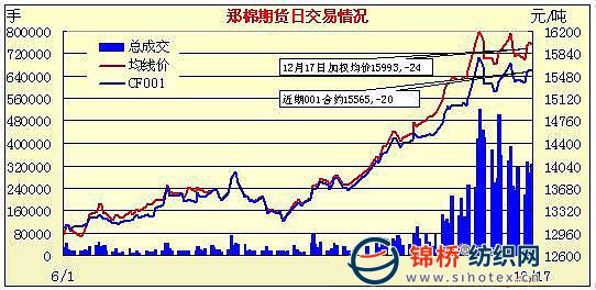 12月17日,鄭棉CF1005合約高開,早盤在多頭平倉與空頭賣盤打壓下回落,午前觸及日低點(diǎn)后在短線回補(bǔ)買盤的支撐下反彈,尾盤多頭主動減倉打壓期價收低,日線形成高開陰線,主要合約成交量放大,持倉量減少。CF1001合約日成交1044手,日減倉332手,終盤持倉量13324手;CF1005合約日成交305388手,日減倉11964手,終盤持倉量205386手?;久媲闆r:,現(xiàn)貨價格主要受國儲棉競拍價格影響,價格基本隨競拍價格上下波動,但波動幅度不大。由于配額發(fā)放日期未定,一直憋著未出手采購的紡織企業(yè)開始有所迷茫,采購上“舉棋不定”,不知當(dāng)前該買不該買,很難判斷后期市場價格是漲是跌。部分棉花企業(yè)受市場上配額消息不斷影響,囤棉信心減弱,開始適價適量銷售,但期貨的上漲,令棉商囤棉信心較強(qiáng),市場成交仍稀少。