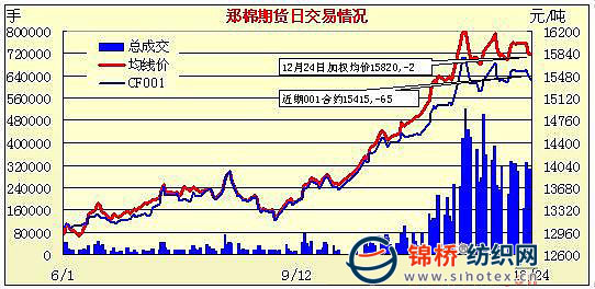 12月24日,鄭棉CF1005合約高開,早盤在空頭賣盤打壓下創(chuàng)日低,隨后空頭回補與多頭低位承接買盤推動期價回升,此后高位震蕩,日線形成高開陽線星,主要合約成交量變化不大,持倉量大幅減少。CF1005合約日成交254274手,日減倉10368手,終盤持倉量189296手;CF1009合約日成交30120手,日減倉3632手,終盤持倉量26706手。基本面情況:現(xiàn)貨價格維持平穩(wěn)。臨近年底,棉企、棉商為還貸款出貨增多,市場成交升溫。據(jù)紡企反映,放在保稅庫的棉花在發(fā)往各個分廠,數(shù)量不多,似乎一個工廠也只能分到140噸左右。新疆棉花的價格有所微跌,23日毛重三級站臺提貨價14600元/噸交貨,較昨日跌30元/噸。