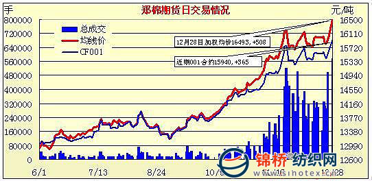 12月28日,鄭棉CF1005合約小幅高開,早盤在多頭買盤推動(dòng)下沖高,午前于前期高點(diǎn)一線盤整震蕩,午后走高收于漲停,日線形成長(zhǎng)陽(yáng)線,主要合約成交量放大,持倉(cāng)量大幅增加。CF1005合約日成交503838手,日增倉(cāng)67330手,終盤持倉(cāng)量284988手;CF1009合約日成交58812手,日增倉(cāng)10988手,終盤持倉(cāng)量42238手?;久媲闆r:大部分申請(qǐng)配額的紡織企業(yè)已經(jīng)知道配額數(shù)量,配額證紡企預(yù)計(jì)下周將拿到。但本次下發(fā)的配額中,增發(fā)的100萬(wàn)噸配額多為加工貿(mào)易,多數(shù)紡織企業(yè)期望盡快拿到滑準(zhǔn)稅配額。另外,據(jù)新疆地區(qū)棉企反映,目前新疆火車站站臺(tái)上已經(jīng)堆滿新疆棉,運(yùn)往內(nèi)地困難程度加劇,并且這幾天又遇降溫降雪天氣,運(yùn)輸難度加大。大部分人士預(yù)測(cè),如果新疆棉運(yùn)輸問題不得以解決,即使配額發(fā)下來,后期內(nèi)地棉價(jià)也將趨于上漲。