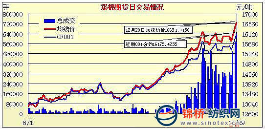 12月29日,鄭棉CF1005合約小幅高開,早盤在多頭買盤推動下沖高,午前反復震蕩,午后多頭買盤推動期價沖高,尾盤受到多頭平倉盤打壓下滑,日線高開陰線,主要合約成交量放大,持倉量先增后減。CF1005合約日成交584560手,日減倉4390手,終盤持倉量280598手;CF1009合約日成交51136手,日減倉8448手,終盤持倉量33790手?;久媲闆r:期貨、撮合雙雙出現(xiàn)大幅上漲,給現(xiàn)貨市場帶來利好。受配額已經(jīng)下發(fā)影響,大多數(shù)紡織企業(yè)進貨不積極,部分紡企認為外棉價格過高,多以觀望等待為主。拋儲完成,更提振了棉企囤棉待漲心理,多數(shù)企業(yè)后期價格看到15500元/噸。