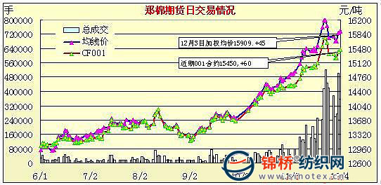 12月4日,鄭棉CF1005合約小幅低開,早盤下探測試前一日午后調(diào)整低點后反抽,盤中測試16000一線回落盤整,午后多頭大量平倉打壓期價下滑創(chuàng)日低,隨后反彈形成橫向整理,日線形成陰線星,主要合約成交量較前一日萎縮,持倉量下降。CF1001合約日成交1874手,日減倉224手,終盤持倉量19876手;CF1005合約日成交338294手,日減倉16292手,終盤持倉量190514手。基本面情況:受新疆棉運輸困難影響,大部分紡織企業(yè)預(yù)定的新疆棉很難運到內(nèi)地,致使紡織企業(yè)采購積極性較強,加之大部分棉花企業(yè)囤棉惜售,市場仍顯僵持,成交價格穩(wěn)中有所回漲,現(xiàn)貨成交價在14700-15000元/噸不等。雖然競拍價格相比現(xiàn)貨價格較低,但加上運費及其他費用和現(xiàn)貨價格差不多。因此,部分紡織企業(yè)仍愿意選擇現(xiàn)貨。籽棉價格受棉籽價格回漲及收購無量影響,價格有所回升。