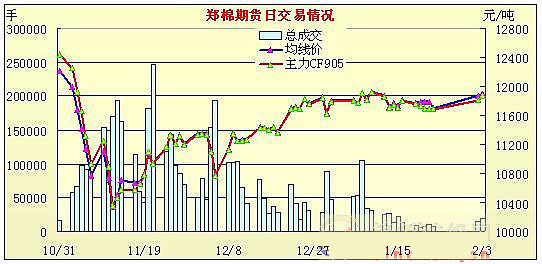 bsp; 2月3日,鄭棉主力合約CF905平開,早盤調(diào)整后在多頭買盤推動下走高,午后重心上移盤整,尾盤加速走高,日線形成小陽線,主要合約成交量溫和放大,持倉量增加。C905合約日成交15552手,日增倉3638手,終盤持倉量41744手;CF907合約日成交1806手,日增倉760手,終盤持倉量6910手;CF909合約日成交586手,日增倉74手,終盤持倉量6194手。