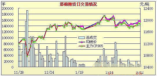 3月12日,鄭棉主力合約CF905小幅低開,早盤沖高后受到多頭平倉打壓調(diào)整,此后低位震蕩,尾盤空頭回補推動期價反彈,日線形成星線,主要合約成交量清淡,持倉量繼續(xù)下降。C905合約日成交2818手,日減倉520手,終盤持倉量38958手;CF907合約日成交486手,日減倉20手,終盤持倉量17056手;CF909合約日成交470手,日減倉90手,終盤持倉量8160手。基本面情況:籽棉收購價格繼續(xù)上漲,棉籽價格也上漲明顯。近兩日紗線價格略有下調(diào),棉花現(xiàn)貨沒有受到大影響,高等級棉花溫和上漲需求量依舊較大,成交也量略有增加。但是紡織廠資金依舊緊張,這對于后市棉花價格上漲仍是不小的壓力。