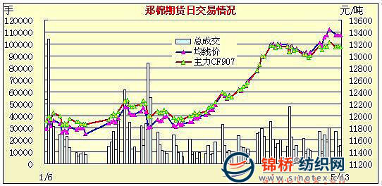 5月13日,鄭棉主力合約CF907低開,早盤CF907合約在多頭平倉的壓力下走低,午前期價(jià)低位整理,遠(yuǎn)期CF909合約低位有一定的空轉(zhuǎn)多換手盤,午后在空頭回補(bǔ)的支撐下回升,日線形成小陰線,日內(nèi)遠(yuǎn)月成交較前一日有所放大,持倉量減少。C905合約日成交180手,日減倉24手,終盤持倉量5226手;CF907合約日成交4242手,日減倉2090手,終盤持倉量34420手;CF909合約日成交9242手,日減倉196手,終盤持倉量17616手?;久媲闆r:現(xiàn)貨價(jià)格再度滯漲,市場(chǎng)成交難有改變。內(nèi)地地產(chǎn)棉數(shù)量已是不多,近期新疆棉用量明顯增加,各地信息反饋,大的紡織廠目前新疆棉用量較大;只有一些小廠在采購內(nèi)地棉花。目前棉花市場(chǎng)供應(yīng)緊張,這兩日拋儲(chǔ)傳聞再掀,成為市場(chǎng)上關(guān)注的焦點(diǎn)。海關(guān)發(fā)布4月份進(jìn)出口數(shù)據(jù),進(jìn)出口數(shù)據(jù)繼續(xù)下行,從年初1月份開始,進(jìn)出口數(shù)據(jù)已經(jīng)連續(xù)4個(gè)月下行了。另內(nèi)地也發(fā)現(xiàn)了甲型H1N1流感病例,這或會(huì)對(duì)農(nóng)產(chǎn)品的行情有一定影響。