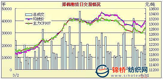 6月11日,鄭棉CF909合約低開,早盤反復震蕩后在多頭買盤支撐下走高,午后空頭回補與多頭買盤共同支撐期價放量收強,日線形成低開中陽線,日內(nèi)成交量變化不大,持倉量增加。CF907合約日成交1670手,日減倉446手,終盤持倉量5764手;CF909合約日成交13982手,日增倉1340手,終盤持倉量31610手?;久媲闆r:現(xiàn)貨價格穩(wěn)中有落,各地成交情況比較平淡。但低等級尤其是5級棉,由于內(nèi)地庫存見底,中小紡企需求旺盛,價格出現(xiàn)一定上漲。隨著拋儲總量上升到日均兩萬噸以上,而且本周開始拋儲推出2003年陳棉資源,使得競拍資源構(gòu)成逐漸豐富,紡織企業(yè)參與度正在上升,很多紡企都已直接或間接參與到拋儲中來。相比而言,各地現(xiàn)貨資源所剩不多,采購困難較大,導致成交情況低迷,現(xiàn)貨市場所占份額正在日漸縮小,未來拋儲價格的主導作用將逐漸顯現(xiàn)。