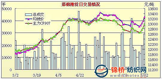 6月12日,鄭棉CF909合約高開(kāi),早盤(pán)小幅調(diào)整后在多頭買(mǎi)盤(pán)支撐下走高,午后期價(jià)創(chuàng)日高,尾盤(pán)震蕩幅度加大,尾盤(pán)在空頭周末回補(bǔ)支撐下相對(duì)收強(qiáng),日線形成高開(kāi)中陽(yáng)線,日內(nèi)成交量溫和放大,持倉(cāng)量增加。CF907合約日成交1806手,日減倉(cāng)116手,終盤(pán)持倉(cāng)量5648手;CF909合約日成交24202手,日增倉(cāng)1578手,終盤(pán)持倉(cāng)量33188手。基本面情況:現(xiàn)貨市場(chǎng)成交繼續(xù)清淡,價(jià)格比較平穩(wěn)。紡織廠對(duì)儲(chǔ)備棉的興致很高,多數(shù)企業(yè)爭(zhēng)相購(gòu)買(mǎi)儲(chǔ)備棉,而對(duì)現(xiàn)貨市場(chǎng)的棉花卻持冷落態(tài)度,由于天氣炎熱了,南方地區(qū)入梅。不少紡織企業(yè)對(duì)新疆棉用得少了。由于目前依舊是紡織旺季,產(chǎn)品銷(xiāo)售形式比較樂(lè)觀。因此不少紡織廠開(kāi)工率現(xiàn)在都很高。美國(guó)農(nóng)業(yè)部報(bào)告,5.29-6.4一周美國(guó)凈簽約出口本年度陸地棉26286噸,較前一周減21%,但較近四周平均值增5%;裝運(yùn)87385噸,較前周增16%,較近四周平均值增21%。凈簽約出口本年度皮馬棉4354噸,為年度來(lái)最高,裝運(yùn)1066噸。另簽約出口09/10年度陸地棉3402噸。當(dāng)周中國(guó)凈簽約進(jìn)口本年度陸地棉10092噸,裝運(yùn)本年度陸地棉24245噸。簽約進(jìn)口本年度皮馬棉794噸。 |