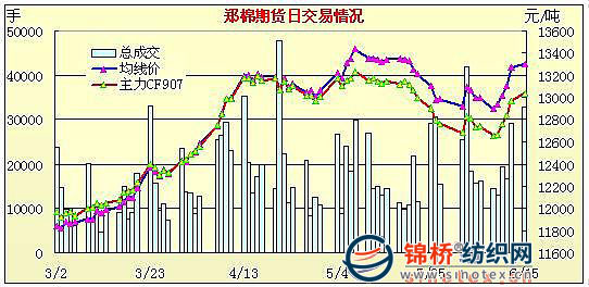6月15日,鄭棉CF909合約平開,早盤多頭平倉(cāng)打壓期價(jià)調(diào)整,隨后空頭回補(bǔ)支撐期價(jià)反彈,盤中寬幅震蕩,午后下探后在多頭集中買盤的推動(dòng)下強(qiáng)力回升,尾盤重心上移放量,日線形成1/2下引線的陽線,日內(nèi)成交量放大,持倉(cāng)量大幅增加。CF907合約日成交2202手,日增倉(cāng)554手,終盤持倉(cāng)量6202手;CF909合約日成交27700手,日增倉(cāng)2160手,終盤持倉(cāng)量35348手。基本面情況:現(xiàn)貨價(jià)格比較穩(wěn)定,各地成交情況依然冷清。目前紡織企業(yè)開機(jī)情況較好,購(gòu)棉積極性較高,近期拋儲(chǔ)推出的陳棉資源競(jìng)拍情況良好,基本無流拍,同時(shí)高等級(jí)新棉熱度延續(xù),但資源有限。拋儲(chǔ)日成交量在萬噸以上,基本滿足了市場(chǎng)上用棉需求,現(xiàn)貨皮棉貨源不多,等級(jí)偏低,成交量不大,多數(shù)為長(zhǎng)期客戶聯(lián)系,價(jià)格基本穩(wěn)定。