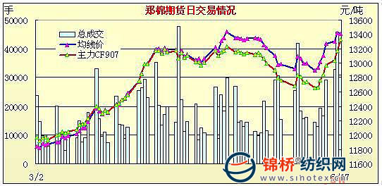 6月17日,鄭棉CF909合約小幅低開,早盤增倉震蕩,午前一度沖高,午后在空頭賣盤打壓下走低,日線形成低開中陰線,日內(nèi)成交量萎縮,持倉量大幅增加。CF907合約日成交2056手,日增倉68手,終盤持倉量6462手;CF909合約日成交26772手,日增倉3836手,終盤持倉量42764手?;久媲闆r:現(xiàn)貨價格基本保持穩(wěn)定,現(xiàn)貨數(shù)量的減少和紡織廠原料庫存的減少,使得現(xiàn)貨價格止跌反彈,有小幅回升之勢,但是成交情況仍然不佳。目前市場上的皮棉供應(yīng),仍以每日的拋儲棉為主,目前紡織廠參與度較高,競拍價格也開始小幅回升,流派量也有所減少,陳棉成交依舊紅火。隨著現(xiàn)貨市場的穩(wěn)定,近兩日電子盤也表現(xiàn)出回暖之勢,雖然紐約期貨在昨日跌停盤,但是今日國內(nèi)鄭棉、撮合均是漲幅收盤,而期貨價格也已升至13000元/噸一線,前期從倉單上拿貨的企業(yè)明顯減少,轉(zhuǎn)而投向拋儲,拋儲關(guān)注度開始升溫。 |