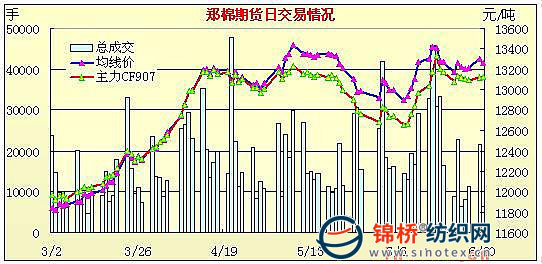 6月30日,鄭棉CF909合約平開,早盤在多頭平倉的壓力下走低,隨后空頭回補(bǔ)支撐期價(jià)止跌反彈,午后增倉上沖后回落,日線形成長2/3下影線的陰線,日內(nèi)成交量萎縮,持倉量減少。CF907合約日成交160手,日減倉52手,終盤持倉量3964手;CF909合約日成交5190手,日減倉366手,終盤持倉量21864手?;久媲闆r:現(xiàn)貨價(jià)格小幅上漲,但上漲勢力明顯減弱,一些地區(qū)現(xiàn)貨報(bào)價(jià)以國儲(chǔ)棉競拍價(jià)格為瞻,成交方面依舊冷清,目前紡織廠使用拋儲(chǔ)棉的數(shù)量明顯增加,紡織廠利潤微薄但仍在堅(jiān)持開機(jī)生產(chǎn),一些中小廠開機(jī)率有所下降。上周末相關(guān)部門推出了規(guī)范儲(chǔ)備棉競賣交易中代理行為的公告,對(duì)參與競拍的企業(yè)給予累計(jì)競買國儲(chǔ)棉數(shù)量的限制,限制標(biāo)準(zhǔn)為企業(yè)4個(gè)月(2009年7月至10月)的最大用棉量。這將會(huì)防止市場上一些企業(yè)借拋儲(chǔ)來炒高棉價(jià),維護(hù)穩(wěn)定棉紡市場的有序發(fā)展。