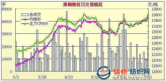 7月10日,鄭棉CF909合約高開,早盤在多頭買盤推動下上沖創(chuàng)日高,隨后平倉盤打壓期價回落,短線形成盤跌格局,終盤收于日內(nèi)相對低位,日線形成長上影線的星線,日內(nèi)成交量微幅放大,持倉量增加;CF1001合約早盤高開后多頭買盤推動期價上行,交投重心上移,日線形成中陽線,盤中成交量放大,持倉大幅增加。CF909合約日成交9588手,日增倉520手,終盤持倉量25476手;CF1001合約日成交9236手,日增倉3252手,終盤持倉量15798手。基本面情況: 現(xiàn)貨價格及本保持穩(wěn)定,現(xiàn)貨上地產(chǎn)棉已是難見,只有一些新疆棉,價格較高,讓一些中小型紡織廠望而卻步。從昨日競拍的情況上看,08年度收儲棉的價格仍在上漲,一些紡織廠反映目前內(nèi)地庫點(diǎn)競拍激烈,使得競拍價格較高,紡織廠一直處于資金緊張的情況,所以對這一價格難以接受,但是為了保證生產(chǎn),不停機(jī),也是無耐選擇。企業(yè)建議增加內(nèi)地庫點(diǎn)日拋儲數(shù)量,減少因競爭而引起的棉價居高。美國農(nóng)業(yè)部報告,6.26-7.2一周美國凈簽約出口本年度陸地棉10591噸,較前一周減70%,較近四周平均值減68%;裝運(yùn)74185噸,較前周減2%,但較近四周平均值增4%。凈簽約出口本年度皮馬棉907噸,較前一周減49%,較近四周平均值減56%;裝運(yùn)2268噸。09/10年度陸地棉凈簽約出口7734噸,下年度皮馬棉凈簽約出口295噸。當(dāng)周中國凈簽約進(jìn)口本年度陸地棉僅816噸,裝運(yùn)陸地棉14061噸。凈簽約下年度皮馬棉635噸。