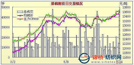 7月14日,鄭棉CF909合約平開,早盤在多頭買盤據(jù)推動下走高,午后重心上移震蕩,日線形成中陽線,日內成交量放大,持倉量小幅增加;CF1001合約小幅高開,多頭買盤推動期價波段上揚,尾盤增倉收強,日線形成長陽線,交易雙方將持倉向CF1001合約推移,致使該合約盤中成交量成倍放大,持倉大幅增加。CF909合約日成交11096手,日增倉718手,終盤持倉量26528手;CF1001合約日成交27890手,日增倉12642手,終盤持倉量30180手。基本面情況:受上周末拋儲價格雙雙走高影響,今日皮棉現(xiàn)貨價格漲幅較前幾日有所提高,不過成交量依舊不大。雖然一些中小紡織廠表示目前企業(yè)生存越發(fā)困難,為了減少虧損,企業(yè)已經(jīng)開始減少用棉量,增加滌綸短纖用量;但是紡織大廠反映,目前紗線銷售尚可,訂單也不錯,用棉量仍比較大。按照目前每日的競拍數(shù)量維持在50000噸左右,預計此次拋儲計劃會在8月中上旬結束,但距新棉上市仍有一段時間,如果國家不采取增發(fā)儲備或進口配額等措施,皮棉現(xiàn)貨市場仍有沖高的可能。 |