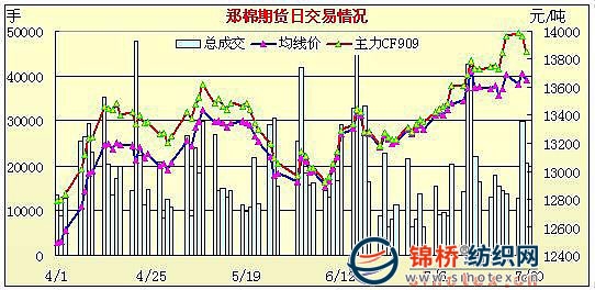 7月29日,鄭棉CF909合約低開后在空頭回補(bǔ)支撐下反彈,盤中區(qū)間減倉盤整,日線形成陽線,日內(nèi)成交量變化不大,持倉量大幅減少;CF1001合約早盤大幅震蕩創(chuàng)日低,隨后多頭買盤支撐期價反抽,盤中高位盤整,尾盤在平倉盤打壓下收弱,日線形成陰線星,日內(nèi)成交量萎縮,持倉量減少。CF909合約日成交4320手,日減倉3706手,終盤持倉量13758手;CF1001合約日成交7788手,日減倉666手,終盤持倉量33360手。基本面情況:現(xiàn)貨價格有小幅上漲,棉商也隨之調(diào)高價格,但是成交不旺。從競拍情況上看,新疆棉占到當(dāng)日成交比例的較大部分,競拍價格也較內(nèi)地低很多,但是由于中小企業(yè)資金問題和新疆棉出疆問題使得中小紡織無法從中得到實惠,觀望氣氛濃厚。一些紡織大廠有選擇的在內(nèi)地和新疆庫點競拍棉花,目前庫存較為充足。