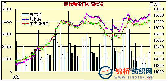 bsp; 7月7日鄭棉CF909合約高開,早盤在多頭買盤推動下沖高,午前區(qū)間盤整,午后多頭買盤推動期價走高,交投重心隨之小幅上移,日線形成小陽線,日內(nèi)成交量萎縮,持倉量增加。CF909合約日成交7632手,日增倉552手,終盤持倉量22656手;CF1001合約日成交1066手,日增倉238手,終盤持倉量12216手?;久媲闆r:現(xiàn)貨價格繼續(xù)穩(wěn)中上漲,成交方面依舊冷清,市場上紡織廠壓力較大,即使銷售順暢,但是利潤微薄,同時棉價居高也是 紡織廠不能承受的,另據(jù)企業(yè)反映,儲備棉出庫仍較慢,這主要是因為個別庫出庫較為集中影響。在最近對 棉花企業(yè)的調(diào)查情況上看,企業(yè)資金問題都較好,400型的大廠參與了去年的收儲計劃,所以還貸情況良好。天氣情況越來越受人們關(guān)注,原因是在全國植棉面積減少的情況下,新棉的產(chǎn)量關(guān)系到了新棉上市價格的走勢。