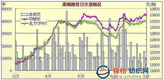 7月8日,鄭棉CF909合約低開,早盤在多頭買盤推動創(chuàng)日高,隨后平倉盤打壓期價調(diào)整,午后一度下調(diào),尾盤在空頭回補(bǔ)與多頭買盤支撐下回穩(wěn),日線形成低開陽線,日內(nèi)成交量變化不大,持倉量增加。CF909合約日成交7226手,日增倉478手,終盤持倉量23134手;CF1001合約日成交1974手,日減倉60手,終盤持倉量12156手?;久媲闆r:現(xiàn)貨價格繼續(xù)保持上漲勢頭,市場上隨買隨用成交冷清,紡織廠受棉價居高、下游產(chǎn)品價格遲遲不漲等原因,小廠停機(jī)限產(chǎn)增多,尤其是在安徽、蘇北、湖北等地,這種情況發(fā)生較多。我國大部分地區(qū)開始炎熱起來,高溫和暴雨漸漸成為天氣的主角,江淮流域進(jìn)入伏旱期;而華北、東北則進(jìn)入多雨季節(jié);東南沿海一帶的熱帶氣旋活動逐漸頻繁。所以農(nóng)業(yè)氣象提醒近期要做好防澇抗旱的準(zhǔn)備,同時棉花進(jìn)入開花結(jié)鈴期要及時打藥施肥。