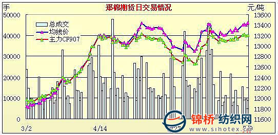 7月9日,鄭棉CF909合約低開,早盤在多頭平倉(cāng)的打壓下慣性下探創(chuàng)日低,隨后空頭回補(bǔ)支撐期價(jià)回穩(wěn)震蕩,午前多頭增倉(cāng)拉動(dòng)期價(jià)上行,午后重心上移,尾盤加速?zèng)_高,日線形成1/2下影線的陽(yáng)線,日內(nèi)成交量變化不大,持倉(cāng)大量增加。CF909合約日成交7398手,日增倉(cāng)1822手,終盤持倉(cāng)量24956手;CF1001合約日成交1036手,日增倉(cāng)390手,終盤持倉(cāng)量12546手。基本面情況:現(xiàn)貨價(jià)格繼續(xù)保持上漲,從昨日儲(chǔ)備棉競(jìng)拍的情況上看市場(chǎng)上低等級(jí)棉價(jià)格提高,由于目前是紡織淡季,而棉花價(jià)格持續(xù)走高,使得一些紡織廠降低了配棉比,同時(shí)一些中小紡織廠轉(zhuǎn)向滌棉、滌粘混紡的生產(chǎn),來(lái)降低棉花的使用量。同時(shí)受內(nèi)地庫(kù)點(diǎn)競(jìng)拍數(shù)量較少,競(jìng)拍激烈,價(jià)格較高影響,一些不急著用棉的企業(yè)開始選擇西部地區(qū)的新疆、甘肅庫(kù)點(diǎn)。據(jù)了解目前新疆、甘肅庫(kù)點(diǎn),競(jìng)拍人數(shù)較少,競(jìng)拍價(jià)格較內(nèi)地偏低,同時(shí)質(zhì)量也較好,除去運(yùn)輸費(fèi)用和運(yùn)輸時(shí)間較內(nèi)地略高外,其性價(jià)比是較高的。