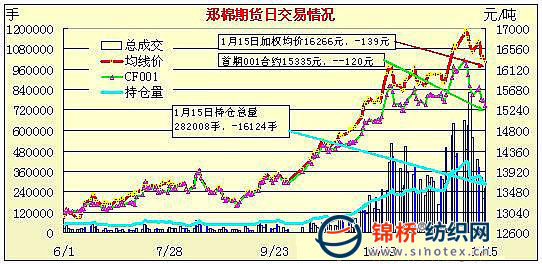 1月15日,鄭棉主要合約低開,早盤整理后增倉下行,隨后多頭買盤支撐期價反抽,盤中高位盤整后在平倉盤打壓下回落,午后橫向盤整,尾盤因周末空頭回補支撐小幅反彈,首期CF001合約全部轉平倉,收于15305元,120元。主要合約日線形成1/2上影線的小陰線,日內CF1005合約成交量萎縮,CF1009合約成交量溫和放大,持倉量繼續(xù)減少。CF1005合約日成交48172手,日減倉2910手,終盤持倉量121984手;CF1009合約日成交207254手,日減倉2808手,終盤持倉量134572手?;久媲闆r:近日電子盤期貨下跌,引部分棉紡企業(yè)看跌情緒上漲,山東部分大型棉企連續(xù)下調皮棉到廠報價,棉花企業(yè)見狀出貨意愿有所增強,尤其是低等級棉成交比前期增加。高等級棉由于稀少,價格仍維持平穩(wěn)。再加上,春節(jié)臨近,部分棉花企業(yè)想“落袋為安”,紡企小幅壓價也能接受。但據(jù)了解,近期因內地降溫影響,新疆目前以保煤、油運輸為主,棉花運輸春節(jié)前壓力很大。另據(jù)紡織企業(yè)反映,當前的皮棉成交價格棉企、紡企雙方都較能接愛,期望價格平穩(wěn)。