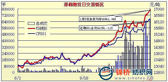 1月5日,鄭棉CF1005合約小幅高開,早盤反復(fù)震蕩,午間在多頭平倉打壓下放量下滑,午后交投重心下移盤整,日線形成陰線,日內(nèi)交量萎縮,持倉量減少;CF1009合約早盤多頭推動(dòng)期價(jià)沖擊日高,隨后在空頭賣盤打壓下走低,午后空頭回補(bǔ)與多頭買盤支撐期價(jià)回穩(wěn),日線形成高開陰線,當(dāng)日成交量放大,持倉大幅增加。CF1005合約日成交275464手,日減倉28250手,終盤持倉量237418手;CF1009合約日成交205358手,日增倉43420手,終盤持倉量138666手?;久媲闆r:現(xiàn)貨市場價(jià)格上調(diào)100-200元/噸不等,但成交仍不多。紡織企業(yè)多消耗前期庫存,都反映拿到的1%配額較少,采購?fù)饷薜膬r(jià)格合算下來也較高。部分紡織廠節(jié)前定單較多較急,在原料采購上有所增強(qiáng)。副產(chǎn)品棉籽價(jià)格有所回升,維持收購的加工廠收購仍顯積極。