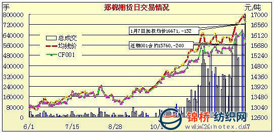 1月7日,鄭棉主要合約高開,早盤震蕩盤整后在短線多頭買盤推動(dòng)下沖高,隨后多頭增量集中平倉打壓期價(jià)迅速下滑觸及跌停,盤中低位在空頭回補(bǔ)支撐下反彈脫離低點(diǎn),午后窄幅盤整,日線形成陰線,日內(nèi)交量放大,CF1009合約成交放天量,持倉量大減。CF1005合約日成交313640手,日減倉37480手,終盤持倉量161464手;CF1009合約日成交493236手,日減倉32830手,終盤持倉量132928手?;久媲闆r:現(xiàn)貨市場價(jià)格仍是穩(wěn)中小幅上調(diào),持棉企業(yè)報(bào)價(jià)高且惜售,現(xiàn)貨三級成交價(jià)在15200元/噸左右,湖北公安最高成交價(jià)已到15300元/噸,部分棉企擔(dān)心后市價(jià)格下跌,銷售積極性提高,現(xiàn)貨成交好轉(zhuǎn)。皮棉價(jià)格向好,加上棉籽價(jià)格回漲,加工廠繼續(xù)上調(diào)籽棉收購價(jià)格,山東、河北籽棉收購量仍較大。