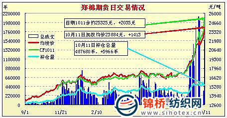 10月11日,鄭棉主要合約高開(kāi),早盤(pán)CF1101合約在短線平倉(cāng)盤(pán)打壓下調(diào)整,隨后在多頭買(mǎi)盤(pán)與空頭回補(bǔ)的推動(dòng)下回升,午后一度觸及漲停,日線形成高開(kāi)1/2下影線的陽(yáng)線,成交量較前一日放大,持倉(cāng)量下滑;CF1105合約早盤(pán)受到短線做空動(dòng)能打壓下滑,隨后回升反彈,午后增倉(cāng)上行,尾盤(pán)在平倉(cāng)盤(pán)打壓下回落,日線形成高開(kāi)陽(yáng)線星,日內(nèi)成交量較前一日增加,持倉(cāng)量增加。CF1101合約日成交136466手,日減倉(cāng)3940手,終盤(pán)持倉(cāng)量84338手;CF1105合約日成交1349812手,日增倉(cāng)8878手,終盤(pán)持倉(cāng)量365416手?;久媲闆r:籽棉價(jià)格受棉籽價(jià)格上漲較快影響,繼續(xù)攀高。棉花企業(yè)收購(gòu)進(jìn)退兩難。北方棉農(nóng)秋收尚未結(jié)束,棉花交售仍難以上量。南方棉花水分仍較大,籽棉價(jià)格不斷攀高,棉企望而卻步。河北籽棉最高價(jià)已漲至5.5元/斤,山東東營(yíng)、博興最高價(jià)漲至5.7元/斤,部分棉企暫停收購(gòu)。棉籽價(jià)格仍繼續(xù)攀高,山東、山東漲至1.7元/斤左在。