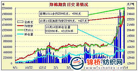 10月14日,鄭棉CF1105合約小幅高開,早盤增倉調(diào)整,隨后在空頭回補與多頭買盤推動下走高,午后在空頭回補推動下加速上揚,終盤全線收于漲停,日線形成陽線,日內(nèi)成交量溫和放大,持倉量回升。CF1101合約日成交185290手,日減倉1690手,終盤持倉量95330手;CF1105合約日成交1742414手,日增倉22656手,終盤持倉量406490手。基本面情況:現(xiàn)貨成交仍一般,棉企報價續(xù)漲。籽棉價格受棉籽價格不斷攀高影響,繼續(xù)攀高,山東部分地區(qū)籽棉收購最高價出現(xiàn)5.95元/斤,棉籽價格漲到1.9元/斤,其他地區(qū)籽棉價格也攀漲到5.5-5.7元/斤一線,收購量仍不大。河北、山東地區(qū)天氣晴好,籽棉質(zhì)量趨好,棉企收購積極。新疆地區(qū)籽棉收購價格在5.5-5.7元/斤,進駐收購企業(yè)較多。近日安徽、湖南等地出現(xiàn)降雨,籽棉水分增加。