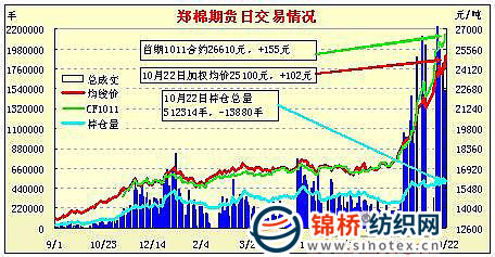 10月22日,鄭棉CF1105合約小幅低開,早盤在多頭買盤推動(dòng)下沖高盤整,隨后在空頭打壓下回落,盤中創(chuàng)日低后在空頭回補(bǔ)的推動(dòng)下回穩(wěn),尾盤在空頭集中回補(bǔ)的支撐下加速走高,日線形成陽線,日內(nèi)成交量萎縮,持倉量先增后減。CF1101合約日成交62102手,日減倉8856手,終盤持倉量69940手;CF1105合約日成交1040488手,日減倉17152手,終盤持倉量343294手?;久媲闆r:現(xiàn)貨市場(chǎng)棉企報(bào)價(jià)繼續(xù)上調(diào),部分軋花廠三級(jí)棉到廠報(bào)26000元/噸。籽棉收購價(jià)格基本平穩(wěn),普遍在5.8-6元/斤,棉農(nóng)交售不積極,收購仍難以上量。棉籽價(jià)格堅(jiān)挺,棉短絨繼續(xù)上漲,山東突破12000元/噸。國儲(chǔ)備棉投放進(jìn)入尾聲,紡織企業(yè)參與積極。