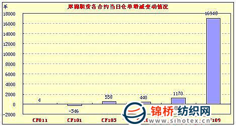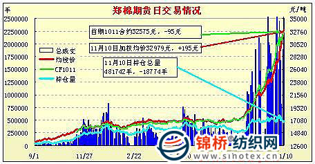 11月10日,鄭棉主要合約高開(kāi),早盤大幅震蕩,午間受到空頭賣盤打壓迅速下滑,午后重心下移整理后再度跳水,尾盤在空頭集中回補(bǔ)支撐下反彈,日線形成高開(kāi)陰線,日內(nèi)成交量萎縮,遠(yuǎn)期合約持倉(cāng)量增加。CF1105合約日成交1507182手,日增倉(cāng)440手,終盤持倉(cāng)量293434手;CF1109合約日成交833504手,日增倉(cāng)16948手,終盤持倉(cāng)量152172手?;久媲闆r:新疆棉報(bào)價(jià)居高,棉企及中間商購(gòu)銷積極,新疆站臺(tái)成交價(jià)31500元/噸左右。內(nèi)地棉報(bào)價(jià)延續(xù)上漲,但加工廠多反映有價(jià)無(wú)市,企業(yè)多存棉,成交稀少。加工廠收購(gòu)籽棉積極,各地最高價(jià)漲至7元/斤左右,棉農(nóng)惜售。