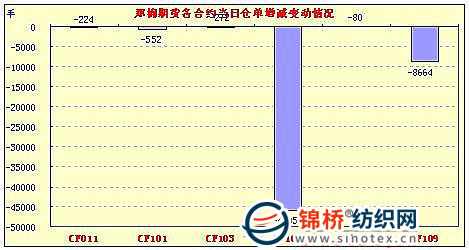 11月12日,鄭棉主要合約低開,盤中在多頭集中平倉的打壓下封于跌停,日線形成低開小陰線,日內(nèi)成交量急劇萎縮,持倉量減少。CF1105合約日成交85144手,日減倉46058手,終盤持倉量220554手;CF1109合約日成交58910手,日減倉8664手,終盤持倉量125270手?;久媲闆r:山東某大型紡織企業(yè)到廠價(jià)下調(diào)200元/噸,三級棉到廠31300元/噸,而且檢驗(yàn)較前幾日嚴(yán)格。幾家大型外商也相應(yīng)下調(diào)皮棉收購價(jià)格,加工廠囤棉信心動搖,銷售意愿較強(qiáng),到紡企交售增多。受皮棉價(jià)格下調(diào)影響,加工廠籽棉收購價(jià)格下調(diào),部分加工廠暫停收購。