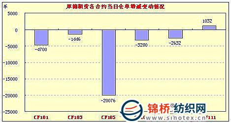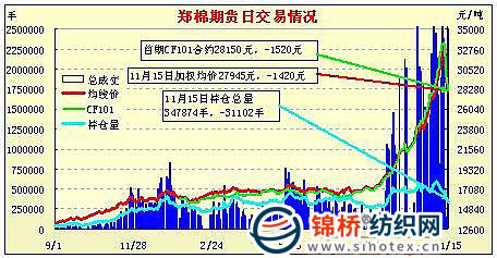 11月15日,鄭棉主要合約低開,早盤在空頭回補的支撐下反抽,盤中橫向整理增倉,午后下滑,尾盤在多頭買盤支撐下回穩(wěn),日線形成低開陽線,日內(nèi)成交量放大,持倉量減少。CF1105合約日成交1421862手,日減倉20076手,終盤持倉量200478手;CF1109合約日成交1057090手,日減倉2632手,終盤持倉量122638手?;久媲闆r:現(xiàn)貨市場出貨明顯增多,一些小的加工廠開始降價出貨,市場看跌氣氛較大。籽棉收購價格大幅回落,一天之內(nèi)部分棉區(qū)籽棉價格下壓0.5元/斤之多,往日只有幾千斤的收購量,這兩日猛增至幾萬斤,軋花廠門口也排起了長隊。