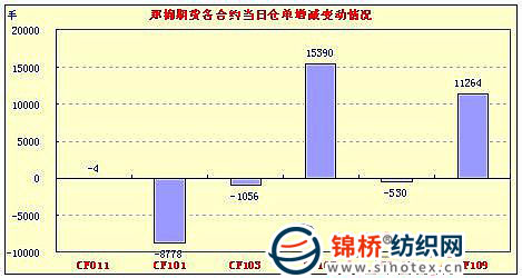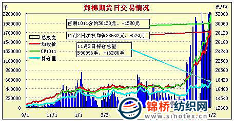11月2日,鄭棉主要合約平開,早盤反復(fù)震蕩后向下調(diào)整,隨后在空頭回補(bǔ)的支撐下反轉(zhuǎn)回升,午后區(qū)間整理,交投重心回升至早盤高點(diǎn)一線,午日線形成小陽線,日內(nèi)成交量放大,持倉量增加。CF1105合約日成交1704576手,日增倉15390手,終盤持倉量368732手;CF1109合約日成交698420手,日增倉11264手,終盤持倉量169480手。 基本面情況:國內(nèi)棉花現(xiàn)貨市場繼續(xù)呈上漲態(tài)勢,一方面棉商呈現(xiàn)不同程度惜售情緒,另一方面紡織企業(yè)不敢留過多庫存,采購資源和接收下游訂單都很謹(jǐn)慎,市場整體成交并不活躍。部分穩(wěn)扎穩(wěn)打的軋花企業(yè)對已存的棉花目前已經(jīng)開始生成倉單,他們表示,按照目前電子盤的價(jià)格已有1000元以上的利潤,為了穩(wěn)妥起見,這也是規(guī)避風(fēng)險(xiǎn)的一種辦法。整體看,現(xiàn)貨行情仍處于上行階段,不過高位風(fēng)險(xiǎn)逐步增加,需要謹(jǐn)慎應(yīng)對。