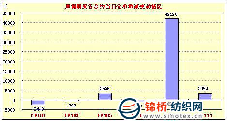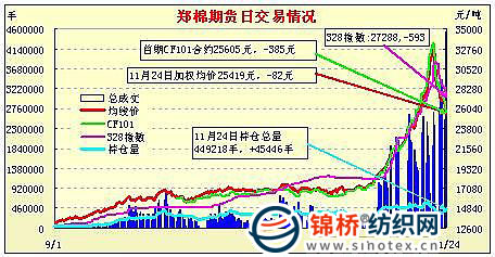 11月24日,鄭棉主要合約小幅低開,早盤在多頭買盤推動下沖高,午間創(chuàng)日高后在空頭打壓下回落,尾盤近月合約受到空頭回補支撐回升,帶動遠月回升,日線形成陽線,日內(nèi)近月成交量放大,遠月成交放天量,持倉量增加。CF1105合約日成交1861390手,日增倉3656手,終盤持倉量209004手;CF1109合約日成交2631106手,日增倉42120手,終盤持倉量207922手?;久媲闆r:現(xiàn)貨市場加工廠出貨仍顯積極,價格繼續(xù)下滑。據(jù)了解,山東某大型紡企昨日再次下調(diào)皮棉收購價格,三級棉報到廠價27000元/噸,四級26600元/噸,仍有加工廠前往交售。加工廠銷售倒掛,部分棉企開始惜售,停止籽棉收購,收購市場處于有價無市狀態(tài),籽棉價格維持在5.5-5.8元/斤左右。
