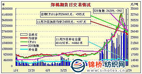 11月29日,鄭棉主要合約平開,早盤在多頭買盤推動下期價一路走高,尾盤受平倉盤打壓調(diào)整,日線形成陽線,日內(nèi)近月成交量放大,持倉量近減遠增。CF1105合約日成交463634手,日減倉10712手,終盤持倉量152846手;CF1109合約日成交1937030手,日增倉16070手,終盤持倉量218450手?;久媲闆r:現(xiàn)貨四級價格穩(wěn)定在26000元/噸左右,部分棉廠有抗跌情緒,紡企繼續(xù)觀望,基本無成交。籽棉收購價格繼續(xù)下調(diào),四級籽棉收購報價多在5.1-5.6元/斤,停收棉廠增多,棉農(nóng)惜售,堅持收購的加工廠日收購量只有幾百斤左右。