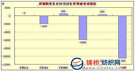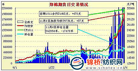 11月4日,鄭棉主要合約微幅低開(kāi),早盤(pán)大幅震蕩后增倉(cāng)下滑,午前空頭回補(bǔ)買(mǎi)盤(pán)助推價(jià)價(jià)格上漲,午后形成窄幅盤(pán)整,日線形成小陽(yáng)線,日內(nèi)成交量萎縮,持倉(cāng)量下滑。CF1105合約日成交1057202手,日減倉(cāng)5886手,終盤(pán)持倉(cāng)量340374手;CF1109合約日成交590124手,日減倉(cāng)10388手,終盤(pán)持倉(cāng)量174730手?;久媲闆r:國(guó)內(nèi)棉花現(xiàn)貨價(jià)格繼續(xù)上漲,但各地棉花企業(yè)報(bào)價(jià)較日前相對(duì)緩和。隨著棉花價(jià)格不斷上漲,紡織企業(yè)采購(gòu)謹(jǐn)慎,基本是少量采購(gòu),不敢輕易多買(mǎi)。隨著棉花價(jià)格的上漲,紡織成品無(wú)論棉紗、棉布還是粘膠等產(chǎn)品都出現(xiàn)大幅度的提價(jià)。近日紡織成品各方面銷(xiāo)售情況比較好,但隨著棉花一天一變的大幅上漲,令紡織企業(yè)有些目不暇接,多數(shù)紡織企業(yè)反映,這邊還沒(méi)考慮好價(jià)錢(qián),那邊又上漲了,市場(chǎng)反應(yīng)遠(yuǎn)比價(jià)格上漲的速度慢半拍。目前棉花企業(yè)也比較謹(jǐn)慎,報(bào)價(jià)過(guò)高,紡織廠幾乎不敢問(wèn)津,報(bào)價(jià)相對(duì)壓低一些,企業(yè)又認(rèn)為比較虧,因此大部分企業(yè)比較惜售,均采取少量出手,而紡織企業(yè)也保守采購(gòu)。