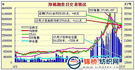 12月17日,鄭棉CF1109合約小幅高開,早盤慣性上沖后受到空頭賣盤壓制回落,盤中大幅震蕩,午后創(chuàng)日低,尾盤在空頭集中回補(bǔ)推動下迅速脫離低點回升,日線形成陽線星,日內(nèi)成交量萎縮,持倉量先增后減。CF1105合約日成交51956手,日減倉3508手,終盤持倉量68416手;CF1109合約日成交1218910手,日減倉10812,終盤持倉量241126手?;久媲闆r:由于部分中小型紡織廠紗線庫存積壓,使得資金方面緊缺,無利采購皮棉,實力較大的紡織廠都有2個月左右的庫存,所以暫時也并不急于購買。同樣進(jìn)口棉的成交情況也并不理想,三級棉的報價在27200-27500元/噸,與國內(nèi)現(xiàn)貨價差較小,但是采購的仍然不多。近期電子盤進(jìn)入盤整局面,波動頻繁,不能給現(xiàn)貨帶來足夠的支撐;南方地區(qū)遭遇降雨降雪影響,收購工作受阻,籽棉價格仍在小幅攀升。