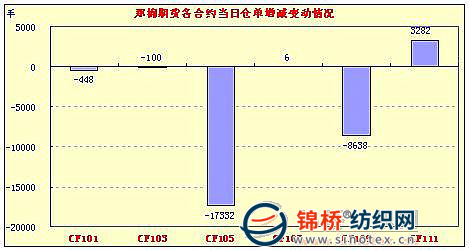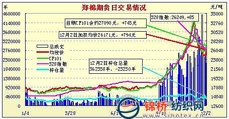 12月2日,鄭棉主要合約高開,早盤多頭推動期價上行震蕩,午間快速沖高,午后重心上移震蕩,尾盤在短線平倉盤壓制下調(diào)整,日線形成高開小陽線,日內(nèi)近月成交量萎縮,持倉量下滑。CF1105合約日成交185212手,日減倉17332手,終盤持倉量117996手;CF1109合約日成交1554216手,日減倉8638手,終盤持倉量208228手?;久媲闆r:現(xiàn)貨市場價格略顯平穩(wěn),紡織廠采購意愿顯現(xiàn),加工廠收購積極性有所增加,山東、安徽籽棉收購價格略有回漲。棉農(nóng)仍較為惜售,市場成交仍是冷清。據(jù)紡廠反饋,新疆產(chǎn)地棉有少量拿貨,提貨價格26800-27000元/噸,毛重。