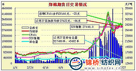 12月27日,鄭棉CF1109合約小幅低開(kāi),早盤(pán)在多頭買盤(pán)推動(dòng)下沖高,隨后空頭打壓期價(jià)回落震蕩,午前多空膠著,午后在多頭平倉(cāng)的壓力下盤(pán)跌,日線形成低開(kāi)小陽(yáng)線,日內(nèi)成交量萎縮,持倉(cāng)量先增后減。CF1105合約日成交29004手,日增倉(cāng)10手,終盤(pán)持倉(cāng)量57694手;CF1109合約日成交840478手,日減倉(cāng)1930,終盤(pán)持倉(cāng)量233868手?;久媲闆r:近期紡織廠電話詢價(jià)較月初有所增加,但是采購(gòu)不多,另?yè)?jù)了解臨近年底,一些需要采購(gòu)的紡廠開(kāi)始小量采購(gòu)以補(bǔ)充庫(kù)存。下游銷售依舊不良,各地紛紛出現(xiàn)低價(jià)棉紗,但是成交依舊疲軟。另?yè)?jù)了解近日出疆棉由前期的每日300個(gè)車左右皮下降到每日250個(gè)車皮左右,要是氮化肥等農(nóng)資產(chǎn)品也在集中運(yùn)輸。籽棉交售仍有一些惜售地區(qū),棉農(nóng)不認(rèn)可當(dāng)前的價(jià)格,還有就是習(xí)慣性存棉,致使這些地區(qū)的軋花廠收購(gòu)量不足,同時(shí)也出現(xiàn)了一些廠停收的現(xiàn)象。