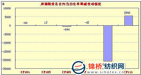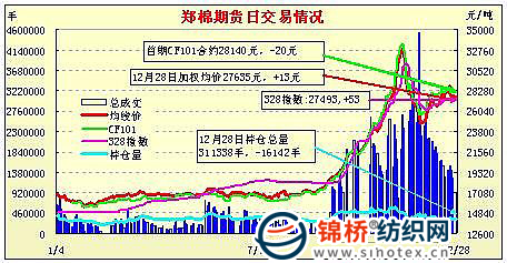 12月28日,鄭棉CF1109合約平開,早盤整理后沖高,高位在平倉盤打壓下回落,午前創(chuàng)日低,午后在空頭回補(bǔ)的支撐下反抽,尾盤延續(xù)窄幅震蕩格局,日線形成小陰線星,日內(nèi)成交量萎縮,持倉量下降。CF1105合約日成交17654手,日減倉694手,終盤持倉量57000手;CF1109合約日成交524886手,日減倉20750手,終盤持倉量213118手?;久媲闆r:棉企受困與成本制約繼續(xù)囤積待售,順價(jià)出貨較少,紡織廠紗線價(jià)格暫時(shí)企穩(wěn),但實(shí)際成交仍有降價(jià);下游布廠大多停機(jī)放假,據(jù)了解今年的放假時(shí)間也多較去年提前一周以上。上周末央行宣布再度加息,加息一事市場傳言多時(shí),對電子盤影響有限,但是在國內(nèi)政策棉花電子盤難以突破前期高點(diǎn),外強(qiáng)內(nèi)弱格局仍將持續(xù)。27日電子盤多空膠著,收盤時(shí)漲跌互現(xiàn)。