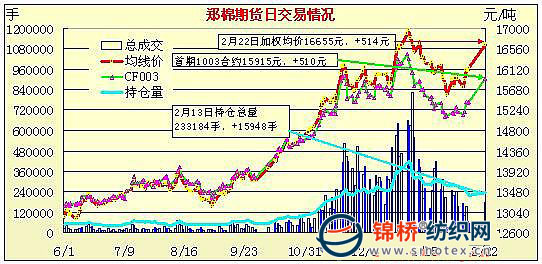 2月22日,春節(jié)長假期間紐期大幅上漲,鄭棉主要合約全線高開,CF1009合約早盤在空頭逢高賣盤打壓下調(diào)整,此后低位盤整,午后多頭買盤支撐期價小幅回升,尾盤在平倉盤壓制下收弱,日線形成高開陰線,日內(nèi)成交量放大,持倉量大幅增加。CF1005合約日成交32488手,日減倉5674手,終盤持倉量74994手;CF1009合約日成交133620手,日減倉19530手,終盤持倉量121230手。 基本面情況:春節(jié)后,電子盤撮合開市連續(xù)2日出現(xiàn)大漲,現(xiàn)貨價格也跟隨上調(diào)。部分棉企見棉市趨于上漲,已經(jīng)開秤繼續(xù)收購籽棉。部分紡企已經(jīng)開始采購,但是尋棉較難。大部分棉企均未開始銷售,而且囤棉的棉企大多觀望。隨著采購的紡企增加,現(xiàn)貨價格仍然趨于上漲。
