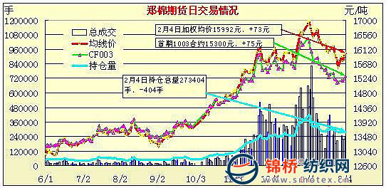 2月4日,鄭棉主要合約低,CF1009合約早盤調(diào)整后在多頭買盤支撐下走高,盤中縮量調(diào)整,尾盤收強(qiáng),日線形成小陽(yáng)線,日內(nèi)成交量變化不大,近月持倉(cāng)量溫和放大,主力合約持倉(cāng)量增加。CF1005合約日成交28706手,日減倉(cāng)7628手,終盤持倉(cāng)量92576手;CF1009合約日成交204924手,日增倉(cāng)6914手,終盤持倉(cāng)量143458手。