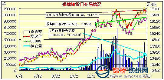 3月15日,鄭棉主要合約高開,CF1009合約早盤橫向盤整,午后一度下滑,尾盤在空頭回補(bǔ)與多頭買盤推動下回升,日線形成陽線星,日內(nèi)成交量放大,持倉量繼續(xù)增加。CF1005合約日成交10022手,日減倉756手,終盤持倉量49148手;CF1009合約日成交247682手,日增倉17964手,終盤持倉量199346手。基本面情況:現(xiàn)貨價格繼續(xù)上漲,賣方占據(jù)市場主導(dǎo)地位,企業(yè)看好高等級棉市場,報價堅挺;同時趁此次上漲行情積極出售手中低等級棉,對于高等級棉出售意愿并不強(qiáng)烈。下游棉紗線行情穩(wěn)中上漲,銷售活躍,需求增加,也促使棉價穩(wěn)步上漲。受到此輪上漲的影響,目前在河南、山東、河北等地的籽棉收購市場,棉農(nóng)交售積極性較高,企業(yè)收購量較大。