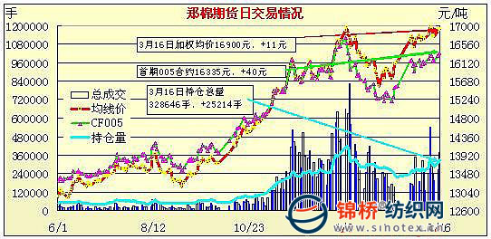 3月16日,鄭棉主要合約平開,CF1009合約早盤增倉下跌,隨后在空頭回補支撐下回穩(wěn),午前多頭集中買盤助推期價迅速沖高,午后橫向盤整,日線形成長下影線的陽線,日內成交量放大,持倉量繼續(xù)增加。CF1005合約日成交16218手,日增倉200手,終盤持倉量48948手;CF1009合約日成交340174手,日增倉21794手,終盤持倉量221140手?;久媲闆r:電子盤再次上漲,現(xiàn)貨市場也“水漲船高”,下游紗線銷售活躍,價格連續(xù)上調。上游棉花現(xiàn)貨稀少,棉企惜售加劇,棉企、棉商連續(xù)提高銷售價格,三級棉毛重提貨價已報到15900-16000元/噸。四級棉提貨價也報到15700元/噸。雖然紡企也在不斷提高采購價,但接受價都定在15600-15700元/噸,與棉商銷售價格仍是差300元/噸左右。以當前棉紗的銷售形勢來看,部分企業(yè)認為棉紗仍有上漲可能,棉價有望沖高17000元/噸。