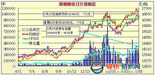 3月25日,鄭棉主要合約低開,CF1009合約早盤調(diào)整后在多頭買盤支撐下回升,午前測試日高,午后在平倉盤壓力下回落,日線形成陽線星,日內(nèi)成交量萎縮,持倉量先增后減。CF1005合約日成交6398手,日減倉1006手,終盤持倉量46366手;CF1009合約日成交168854手,日減倉328手,終盤持倉量233578手?;久媲闆r:現(xiàn)貨報(bào)價(jià)上調(diào),下游紡織企業(yè)紗線價(jià)格繼續(xù)上揚(yáng),純棉紗俏銷,給上游棉花價(jià)格有利支撐。內(nèi)地棉現(xiàn)貨三級提貨價(jià)普遍上漲到16500元/噸,紡企基本能夠接受,成交增多。部分棉商繼續(xù)看漲后市,打算等到四月底再銷售。紡織企業(yè)庫存維持較低水平,大部分企業(yè)庫存只有一個(gè)月左右,開始四處尋棉。近期,棉籽價(jià)格下跌較快,由原來的1.45-1.5元/斤,普遍下跌到0.35-0.4元/斤。受皮棉銷售利潤可觀影響,河北、山東地區(qū)棉企積極收購,并調(diào)高了籽棉收購價(jià)格,河北威縣地區(qū)某棉日收購量能達(dá)到12萬左右。