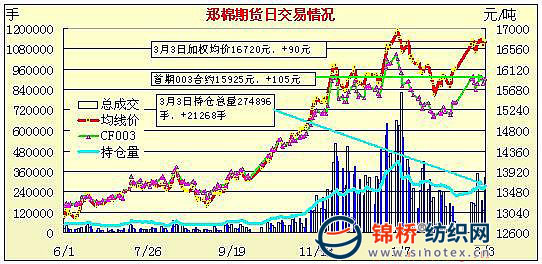 3月3日,鄭棉主要合約平開,CF1009合約早盤慣性下探后低位換手,隨后多頭集中買盤推動(dòng)期價(jià)沖高,此后高位震蕩盤升,尾盤在短線平倉的作用下調(diào)整,日線形成陽線,日內(nèi)成交量放大,持倉量大量增加。CF1005合約日成交15264手,日減倉2380手,終盤持倉量60576手;CF1009合約日成交294112手,日減倉20258手,終盤持倉量164776手。基本面情況:現(xiàn)貨市場(chǎng)棉商報(bào)價(jià)繼續(xù)上調(diào),下游紗線銷售有所啟動(dòng),部分紡企繼續(xù)上調(diào)棉花采購價(jià)格,成交略有好轉(zhuǎn)。北部地區(qū)河北、山東受大雪影響,購銷緩慢。皮棉價(jià)格的上漲,帶動(dòng)零星收購的企業(yè)上調(diào)籽棉收購價(jià)格。