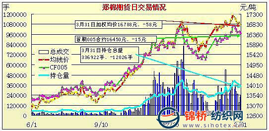 3月31日,鄭棉主要合約低開(kāi),CF1009合約早盤反復(fù)震蕩后在多頭買盤推下大幅上沖創(chuàng)日高,隨后在平倉(cāng)盤打壓下走低盤整,午后平倉(cāng)盤與空頭賣盤打壓期價(jià)一度跳水,尾盤在短線回補(bǔ)的推動(dòng)下反彈,日線形成1/2上影線的陰線,日內(nèi)成交量變化不大,持倉(cāng)量繼續(xù)減少。CF1005合約日成交4498手,日減倉(cāng)1218手,終盤持倉(cāng)量38980手;CF1009合約日成交189514手,日減倉(cāng)6572手,終盤持倉(cāng)量195904手?;久媲闆r:新疆棉運(yùn)輸有所緩解,到貨速度加快,促使不少內(nèi)地棉商赴新疆采購(gòu)。由于電子盤期貨、撮合連續(xù)振蕩不穩(wěn),棉商出貨較為積極,報(bào)價(jià)主動(dòng),但紡織企業(yè)采購(gòu)放緩,觀望態(tài)度明顯,現(xiàn)貨價(jià)格穩(wěn)中有所回調(diào)。尤其是大型紡企的降價(jià)對(duì)棉企心理造成一定影響,讓利出貨增多。下游紡企訂單火爆,對(duì)上游棉花價(jià)格較為利好。