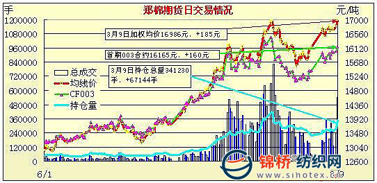 3月9日,鄭棉主要合約平開,CF1009合約早盤反復(fù)震蕩后在多頭集中買盤推動(dòng)下放量沖高,此后高位盤整,尾盤在少量平倉盤壓制下調(diào)整,日線形成陽線,日內(nèi)成交量成倍放大,持倉量大幅增加。CF1005合約日成交21234手,日減倉1588手,終盤持倉量58610手;CF1009合約日成交489530手,日增倉56982手,終盤持倉量217828手。 基本面情況:現(xiàn)貨報(bào)價(jià)繼續(xù)上漲,紡企采購壓力不斷增大。雖然大型紡企庫存不低,但也多對(duì)后期看漲,目前也在陸續(xù)進(jìn)行采購。各地現(xiàn)貨報(bào)價(jià)繼續(xù)上揚(yáng),新疆花二級(jí)在15700-15800元/噸。長絨棉137級(jí)在25000元/噸。山東某棉企三級(jí)公檢棉報(bào)價(jià)到15800元/噸。江蘇棉企報(bào)價(jià)在15600元/噸,安徽棉企報(bào)價(jià)15400元/噸。紡企反映,可能是運(yùn)輸不暢的問題,日前新疆棉較好購買,而內(nèi)地棉報(bào)價(jià)都過高,并且囤棉企業(yè)稀少,不好購買??傮w資源稍顯不足成為近期市場(chǎng)的熱點(diǎn),棉商惜售,成交量不大。