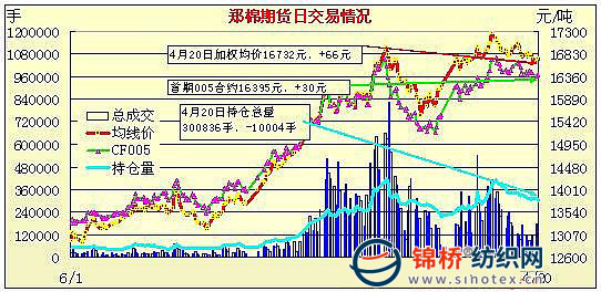 4月20日,鄭棉主要合約高開(kāi),CF1009合約早盤(pán)沖高回落,盤(pán)中低位大量減倉(cāng),尾盤(pán)空頭集中回補(bǔ)拉升期價(jià)收高,日線形成高開(kāi)陽(yáng)線,日內(nèi)成交量萎縮,持倉(cāng)量大幅減少;CF1101合約高開(kāi)盤(pán)整,午后在多頭買盤(pán)推動(dòng)下收高,日線形成陽(yáng)線,日內(nèi)成交量萎縮,持倉(cāng)小幅增加。CF1009合約日成交676820手,日減倉(cāng)17912手,終盤(pán)持倉(cāng)量143358手;CF1101合約日成交35616手,日減倉(cāng)7388手,終盤(pán)持倉(cāng)量85728手?;久媲闆r:紡企見(jiàn)電子盤(pán)出現(xiàn)大幅下跌,觀望情緒較濃,繼續(xù)關(guān)注,準(zhǔn)備適時(shí)在期轉(zhuǎn)現(xiàn)上采購(gòu)。一方面期轉(zhuǎn)現(xiàn)質(zhì)量較為有保障,另一方面目前鄭期價(jià)格走低。撮合仍受現(xiàn)貨支撐,表現(xiàn)堅(jiān)挺。棉商出貨積極性有所提高,但市場(chǎng)上多為期轉(zhuǎn)現(xiàn)棉花,現(xiàn)貨多為四、五級(jí)棉。新疆棉內(nèi)地三級(jí)提貨價(jià)在16400-16600元/噸。棉花種植繼續(xù)受氣溫較低影響,北疆至今仍沒(méi)有開(kāi)始播種,南疆大部分已經(jīng)種植,內(nèi)地北部地區(qū)仍繼續(xù)推遲播種。