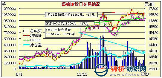 4月23日,鄭棉主要合約小幅高開,CF1009合約早盤在空頭回補的推動下沖高,隨后在平倉盤打壓下震蕩調(diào)整,日線形成陽線星,日內(nèi)成交量萎縮,持倉量減少;CF1101合約在多頭買盤推動下上沖,午后小幅調(diào)整,日線形成陽線,日內(nèi)成交量放大,持倉增加。CF1009合約日成交35522手,日增倉5738手,終盤持倉量131940手;CF1101合約日成交87292手,日增倉13474手,終盤持倉量124878手。基本面情況:印度棉限制出口漫延到國內(nèi)棉花市場,棉商銷售轉(zhuǎn)緩,紡企采購高等級棉增多,價格小幅上調(diào)。別據(jù)紡企反饋,近日新疆棉動力加大,對內(nèi)地市場形成有力補充。山東、河北、河南氣溫有所回升,棉花種植陸續(xù)展開。