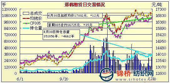 4月30日,鄭棉主要合約低開(kāi),CF1009合約在空頭回補(bǔ)與多頭買(mǎi)盤(pán)推動(dòng)下震蕩上揚(yáng),午間多頭買(mǎi)盤(pán)再涌,帶動(dòng)期價(jià)增倉(cāng)上揚(yáng),午后重心上移震蕩,日線形成低開(kāi)陽(yáng)線,日內(nèi)成交量變化不大,持倉(cāng)量小幅增加;CF1101早盤(pán)受到空頭回補(bǔ)推動(dòng)回升,午后追隨近月上漲,日線形成低開(kāi)陽(yáng)線,日內(nèi)成交量較前一日下降,持倉(cāng)繼續(xù)減少。CF1009合約日成交67092手,日增倉(cāng)1700手,終盤(pán)持倉(cāng)量135036手;CF1101合約日成交128936手,日增倉(cāng)8338手,終盤(pán)持倉(cāng)量139780手。 基本面情況:據(jù)反映,個(gè)別企業(yè)手中仍有好三級(jí)的棉花,但是出貨較少,計(jì)劃在五一之后出貨;紡織廠方面也要面臨五一小長(zhǎng)假的問(wèn)題,補(bǔ)庫(kù)意愿較強(qiáng),由于各棉區(qū)地產(chǎn)棉質(zhì)量存在差異,所以各地紡織廠在采購(gòu)地產(chǎn)棉上面也表現(xiàn)不一,但對(duì)新疆棉的熱情依然較高。今明兩天隨著全國(guó)大范圍地區(qū)的天氣轉(zhuǎn)好好,各棉區(qū)的春播工作將進(jìn)一步擴(kuò)大,初步預(yù)計(jì)一些地區(qū)的植棉面積將成增加態(tài)勢(shì)。