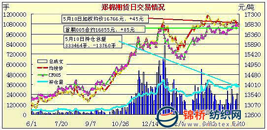 5月10日,鄭棉主要合約高開,CF1009合約橫向盤整,午后空頭回補支撐期價上揚收于日高,日線形成高開小陽線,日內(nèi)成交量萎縮,持倉量減少;CF1101早盤高開盤整,午前調(diào)整受到多頭買盤支撐回穩(wěn),午后空頭集中回補支撐期價收高,日線形成高開陽線,日內(nèi)成交量萎縮,持倉量減少。CF1009合約日成交30950手,日減倉5138手,終盤持倉量1126164手;CF1101合約日成交138518手,日減倉7946手,終盤持倉量138518手?;久媲闆r:市場上棉花現(xiàn)貨交易價格繼續(xù)上揚,新疆棉紡企采購積極,二級價格普遍在17500元/噸。市場整體成交不活躍,紡企尤為關(guān)注進(jìn)口棉配額是何時發(fā)放。